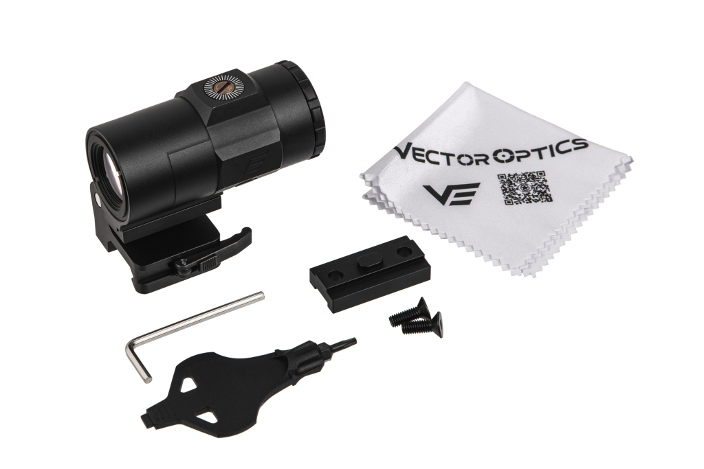 Корпус увеличителя сделан из алюминиевого сплава 6061-T6 в черном матовом цвете. Ударопрочный, предназначенный для настоящего калибра огня. Окуляр имеет быструю фокусировку при регулировке линзы окуляра от -2 до 2. Компактный размер для большего удобства, регулируемый угол ветра и высота, кристально чистый, большое фокусное расстояние. Встроенное крепление Picatinny QD Mount 37 мм (1,4 дюйма) снизу до центра кольца, полностью металлическое. Комплект включает в себя подставку 5 мм, руководство пользователя, чистящую салфетку, шестигранный ключ. Совместим с коллиматорными прицелами: SCRD-04, SCRD-12II, SCRD-34, SCRD-41.