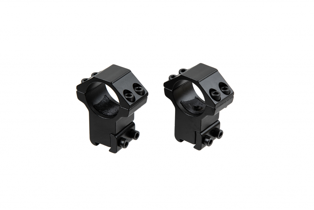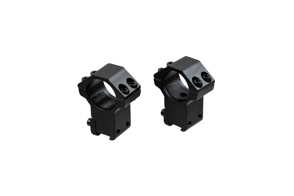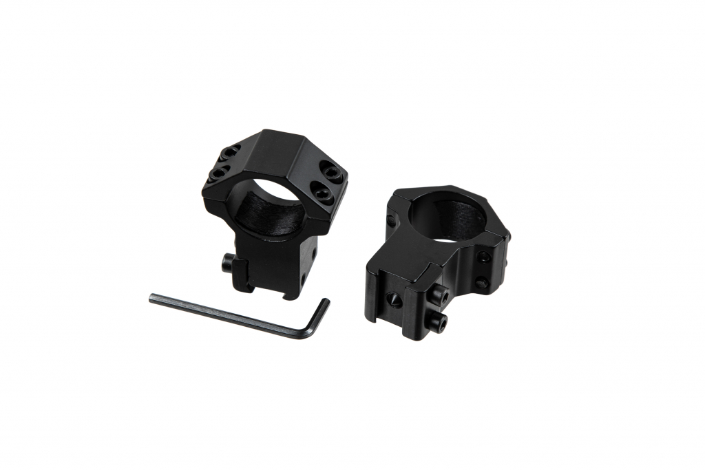 Кольца диаметром 25,4 мм (1 дюйм) для планки «ласточкин хвост» 11 мм с высоким профилем, высота – 34 мм. Кольца изготовлены из алюминиевого сплава 6063-T6 с чёрной матовой отделкой, благодаря материалу имеют лёгкий вес – 106 г. В комплект колец входит шестигранный ключ, который обеспечивает быструю и лёгкую установку. Кольца прошли испытания на мощных пневматических винтовках и огнестрельном оружии.
