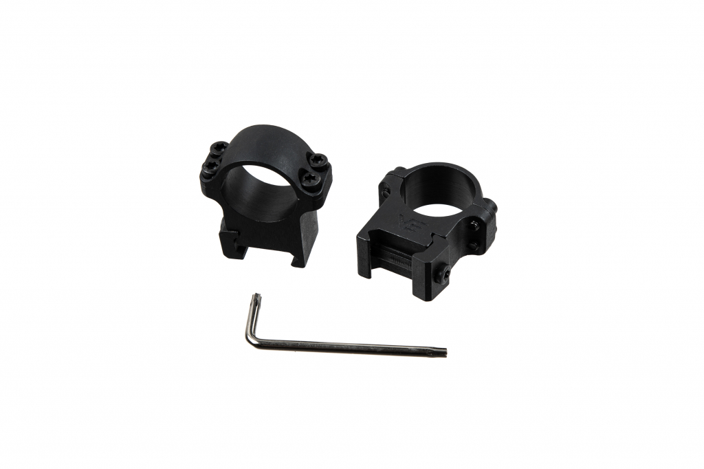 Сверхпрочные кольца диаметром 25,4 мм (1 дюйм) для планки Вивера и Пикатинни 21 мм, изготовлены из стали. Кольца имеют средний профиль, высота от низа до центральной оси колец – 25,4 мм (1 дюйм). Комплект колец включает шестигранный ключ.