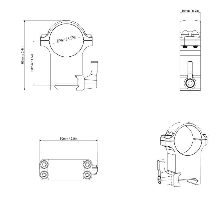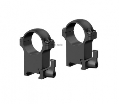 Прочные стальные кольца диаметром 30 мм и весом 316 г имеют быстросъемное крепление и высокий профиль – высота от низа крепления до центральной оси колец 38 мм. Каждое кольцо имеет по 4 Torx винта, отверстия сделаны на ЧПУ с точностью допусков. Кольца крепятся на планку Вивер/Пикатинные 21 мм.