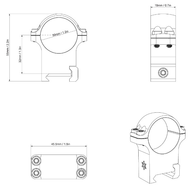 Сверхпрочные кольца диаметром 30 мм для планки Вивера и Пикатинни 21 мм, изготовлены из стали. Кольца имеют средний профиль, высота от низа до центральной оси колец – 31,8 мм (1,25 дюйм). Комплект колец включает шестигранный ключ.