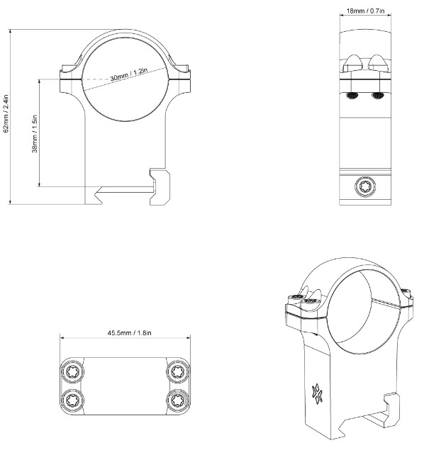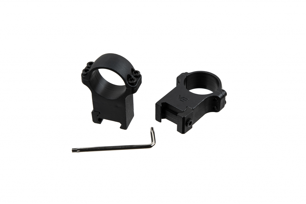 Сверхпрочные кольца диаметром 30 мм для планки Вивера и Пикатинни 21 мм, изготовлены из стали. Кольца имеют высокий профиль, высота от низа до центральной оси колец – 38,1 мм (1,5 дюйм). Комплект колец включает ключ Torx T15.