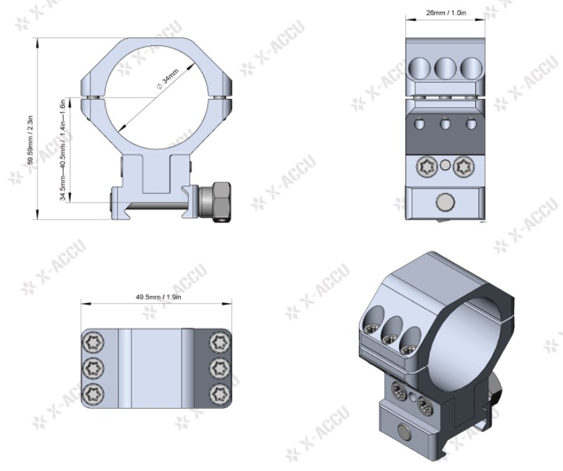 6 винтов Torx на каждом кольце, подходит для прицелов с объективом 60 мм.
