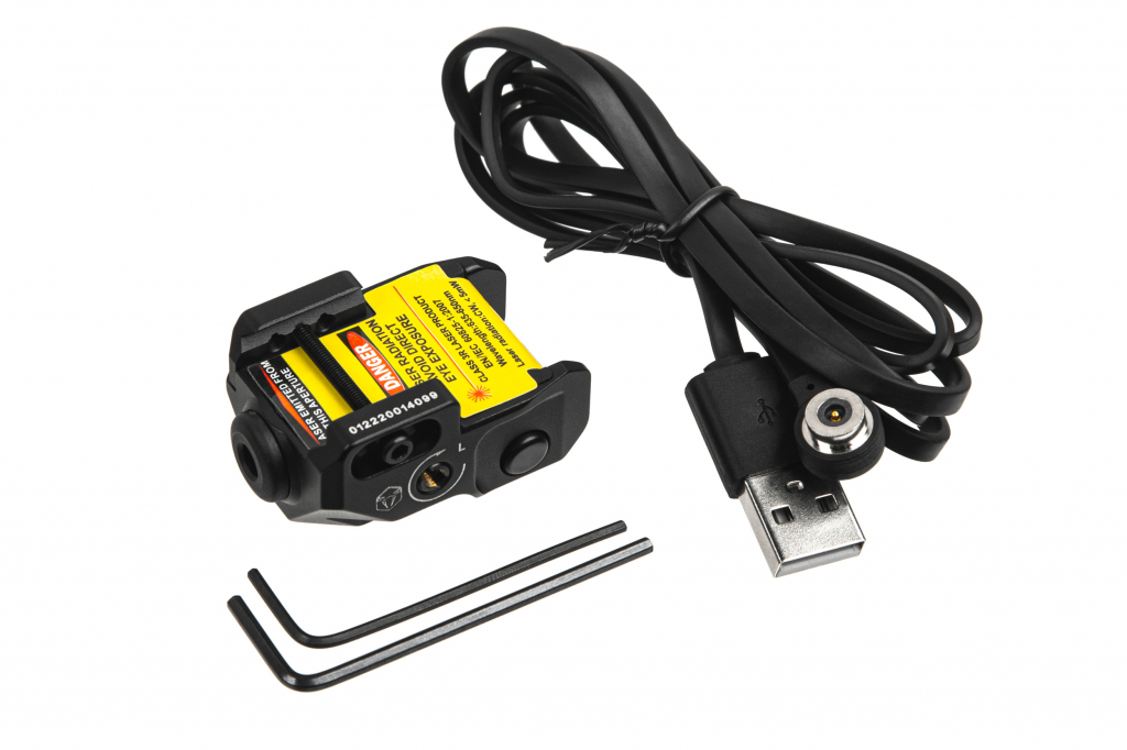 Тактический низкопрофильный компактный регулируемый лазерный прицел, корпус изготовлен из алюминиевого сплава 6061-T6, благодаря чему имеет лёгкий вес: 33 г. Класс IIIa мощностью <5 мВт длина волны 630-650 нМ. Цвет лазерного прицела - красный, имеет кнопку переключателя для включения/выключения питания. Одним из главных преимуществ целеуказателя является мгновенный сенсорный переключатель Smart-Sense для бесшумной и быстрой работы. Встроенная литиевая аккумуляторная батарея, совместимая с зарядным устройством магнитного типа. Имеет индикатор зарядки и заряда батареи для уточнения состояния устройства. Целеуказатель крепится на вивер 21 мм. Комплект содержит пластиковую розничную упаковку, кабель с магнитным проводом, зарядное устройство USB, 2 шестигранных ключа для быстрой горизонтальной и вертикальной регулировки, руководство пользователя.