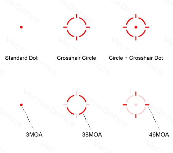 MRS (Multi-Reticle System): Прицел оснащен системой Multi-Reticle System, которая позволяет переключаться между 3-мя типами прицельных сеток (точка 3 МОА, Круг 38 МОА с рисками 46МОА, Точка 3 МОА с кругом 38 МОА и с рисками 46МОА) , предоставляя пользователю возможность выбора наиболее удобной настройки для конкретных условий стрельбы.