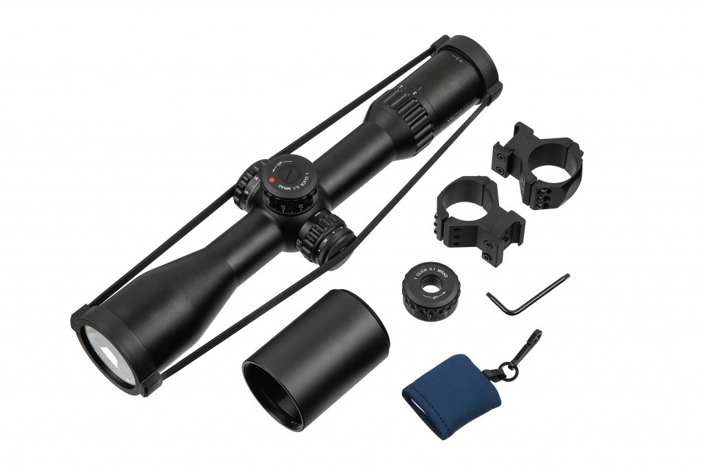 Комплектация: Одна пара колец для прицела на планку Пикатини 34 мм, защитные крышки, запасной барабанчик поправок, солнцезащитная бленда, чистящая салфетка, инструкция пользователя.