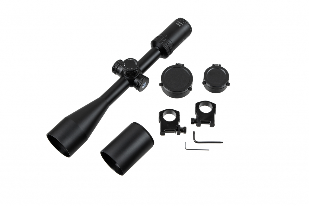 Комплект прицела включает откидные крышки объектива и окуляра, пару колец Вивер диаметром 25.4 мм с высоким профилем, антибликовую бленду, салфетку для обслуживания оптики.