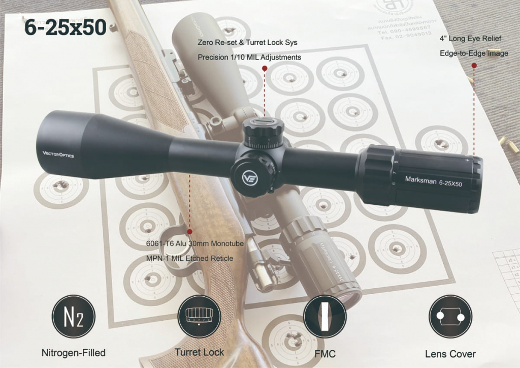 Прицел оптический Vector Optics Marksman 6-25x50 (30mm) SFP во второй фокальной плоскости имеет барабанчики поправок с фиксацией, тонкую гравированную сетку и достаточную кратность чтоб стать отличным дополнением к РСР или малокалиберной винтовке, т.к. отстройка параллакса возможна уже от 10 метров. В комплект прицела входят: крышки объектива и окуляра на резинках, сменный рычаг управления кратностью, антибликовая насадка на объектив, сменные барабанчики поправок и кольца.
