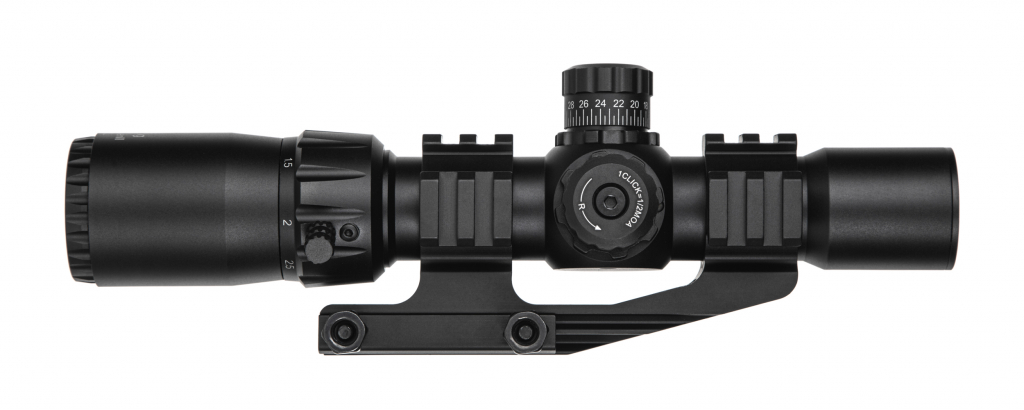 Прицел Mustang Gen.2 1-4X30 SFP имеет трехуровневую систему подсветки: красный, зеленый и синий свет. В качестве источника питания используется батарейка типа CR2032. Прицел крепится с помощью планки Пикатинни.