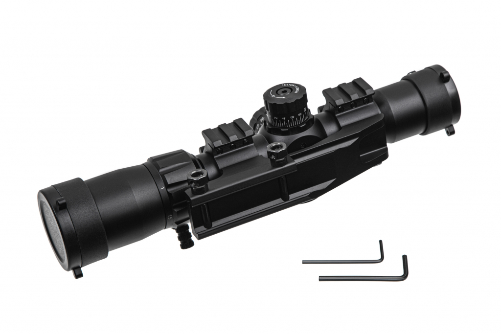 Увеличение – 1-4х. Диаметр объектива составляет 30 миллиметров. Поле зрения – 105,8-26,2 фута на 100 Yds. Диаметр выходного зрачка – 11,0-5,0 мм.