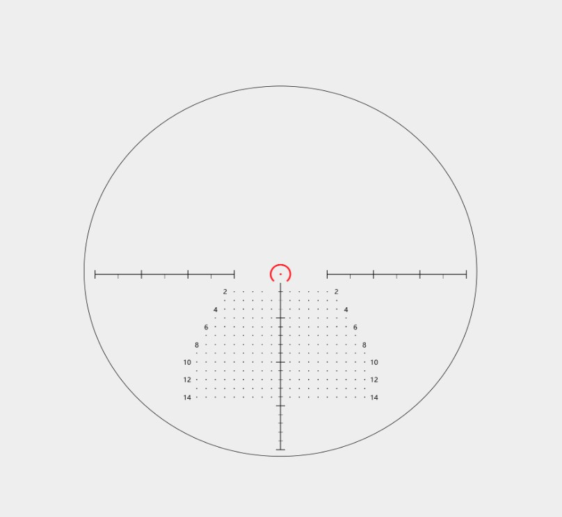 • Сетка VS 10-1 MIL во 2-й фокальной плоскости (SFP) — стабильная, удобная для прицеливания с подковой вокруг центральной точки и имеет «деревовидную» структуру для стрельбы выносом с учетом ветра.