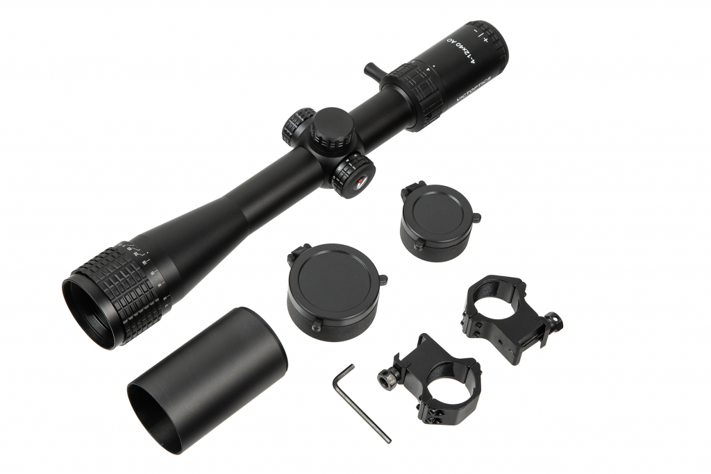 Комплектация: руководство пользователя, салфетка для очистки, откидные крышки объектива и окуляра, солнцезащитная бленда, пластиковый ключ, рычаг регулировки кратности, кольца 30 мм на планку Пикатинни.
