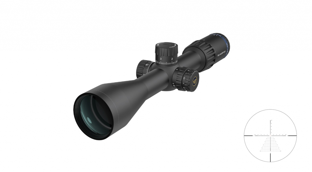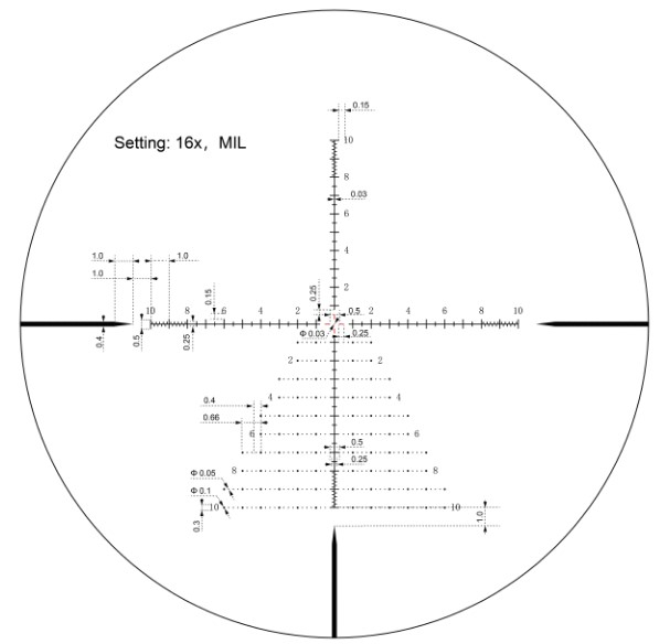 Прицельная сетка: Сетка расположена во второй фокальной плоскости (SFP), что означает, что ее размер остается неизменным при изменении увеличения. На кратности 16х прицел позволяет правильно измерять дистанцию до объектов, размер которых известен.
