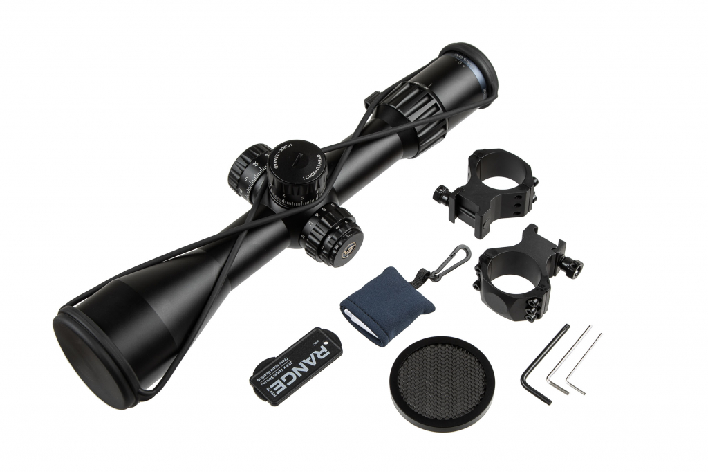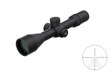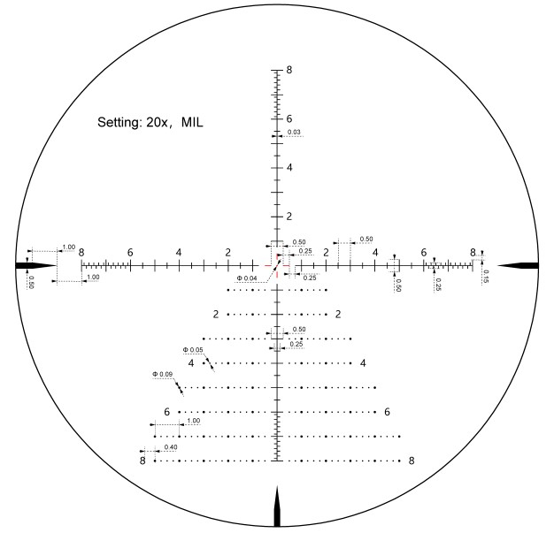 Прицельная сетка: Сетка расположена во второй фокальной плоскости (SFP), что означает, что ее размер остается неизменным при изменении увеличения. Это удобно для пользователей, предпочитающих постоянный размер сетки независимо от уровня увеличения. На кратности 20-х прицел позволяет правильно измерять дистанцию до объектов, размер которых известен. Сетка в MIL облегчает просчет благодаря метрической системе, а также позволяет производить выстрелы «выносом» благодаря древовидной структуре.