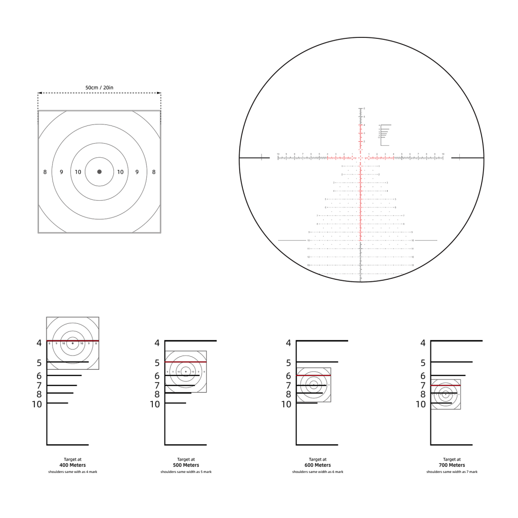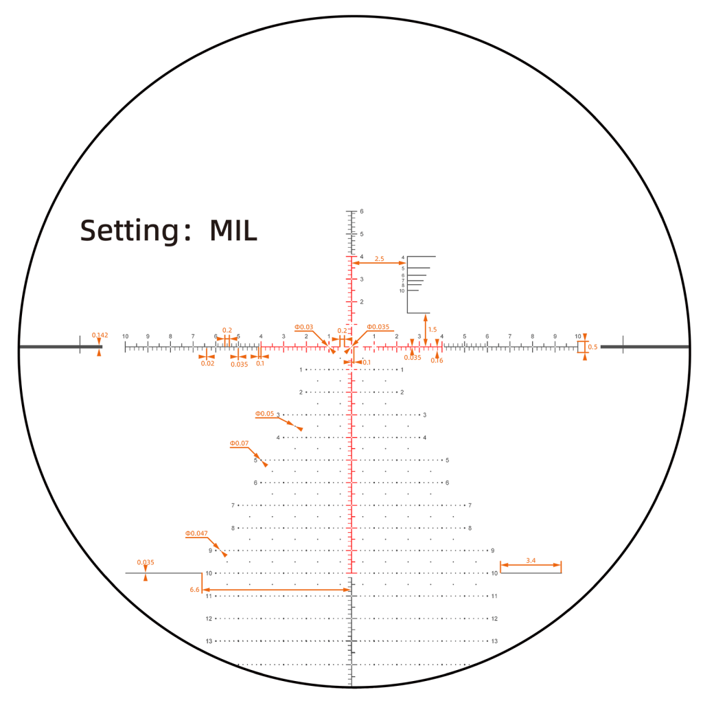 Прицельная сетка VEC-MBR2 имеет центральную точку 0.035 Mil для стрельбы на большие дистанции. Разметка с шагом 0.2 Mil для точных поправок, создана для PRS (Precision Rifle Shooting) соревнований. Сетка в виде «елочки» для быстрой коррекции выстрелов. Верхняя правая часть - для быстрого определения дистанции.