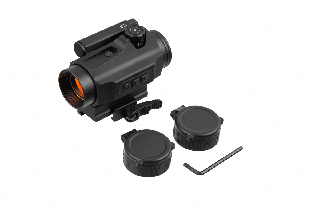 Комплектація: Швидкоз’ємне кріплення на планку Вівер/Пікатіні, шестигранний ключ, відкидні кришки об’єктива і окуляра, серветка для чищення та інструкція.
